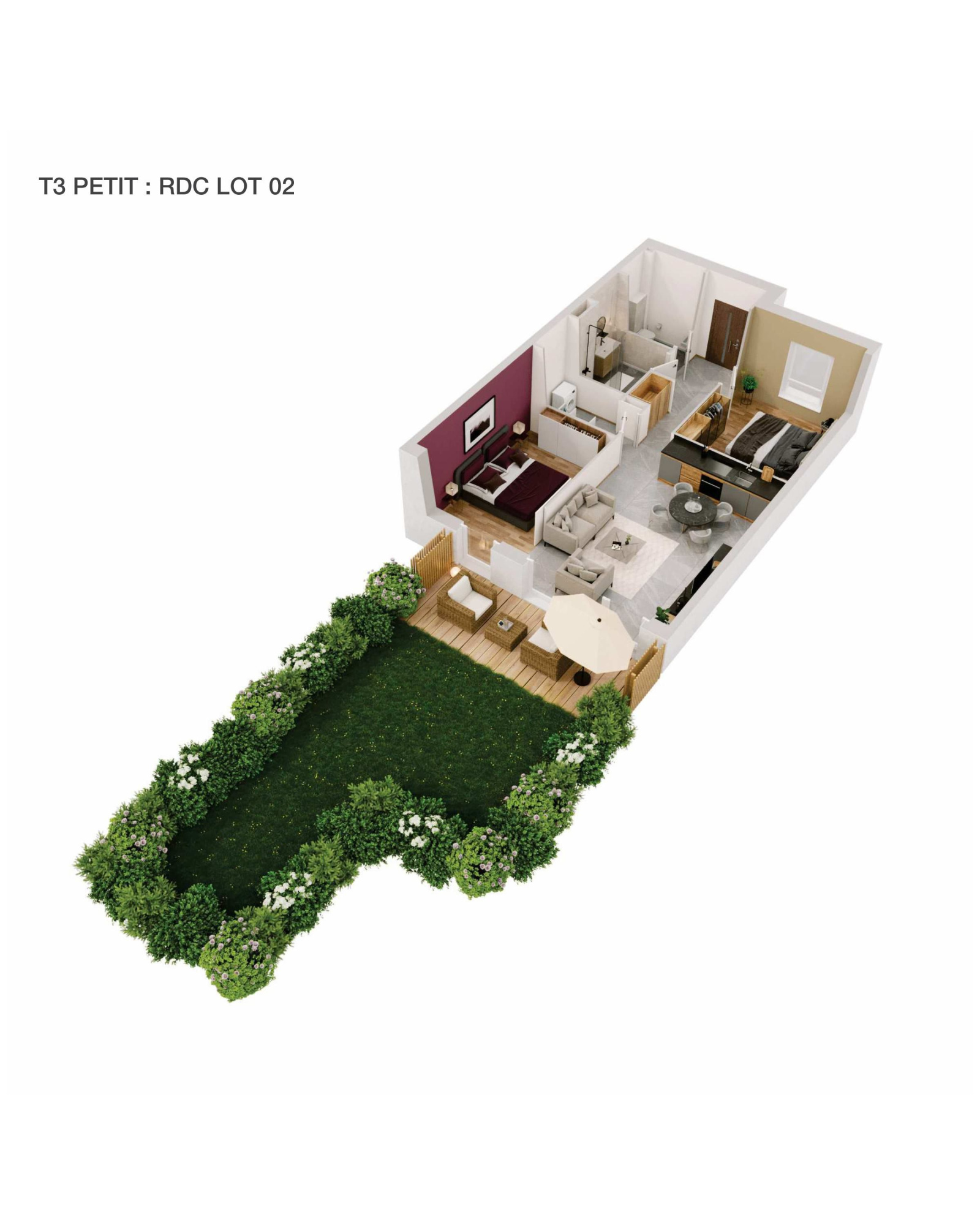 deux chambres dont une donnant accès à la terrasse et au jardin, cuisine ouverte sur séjour lumineux offrant l'accès à l'extérieur !