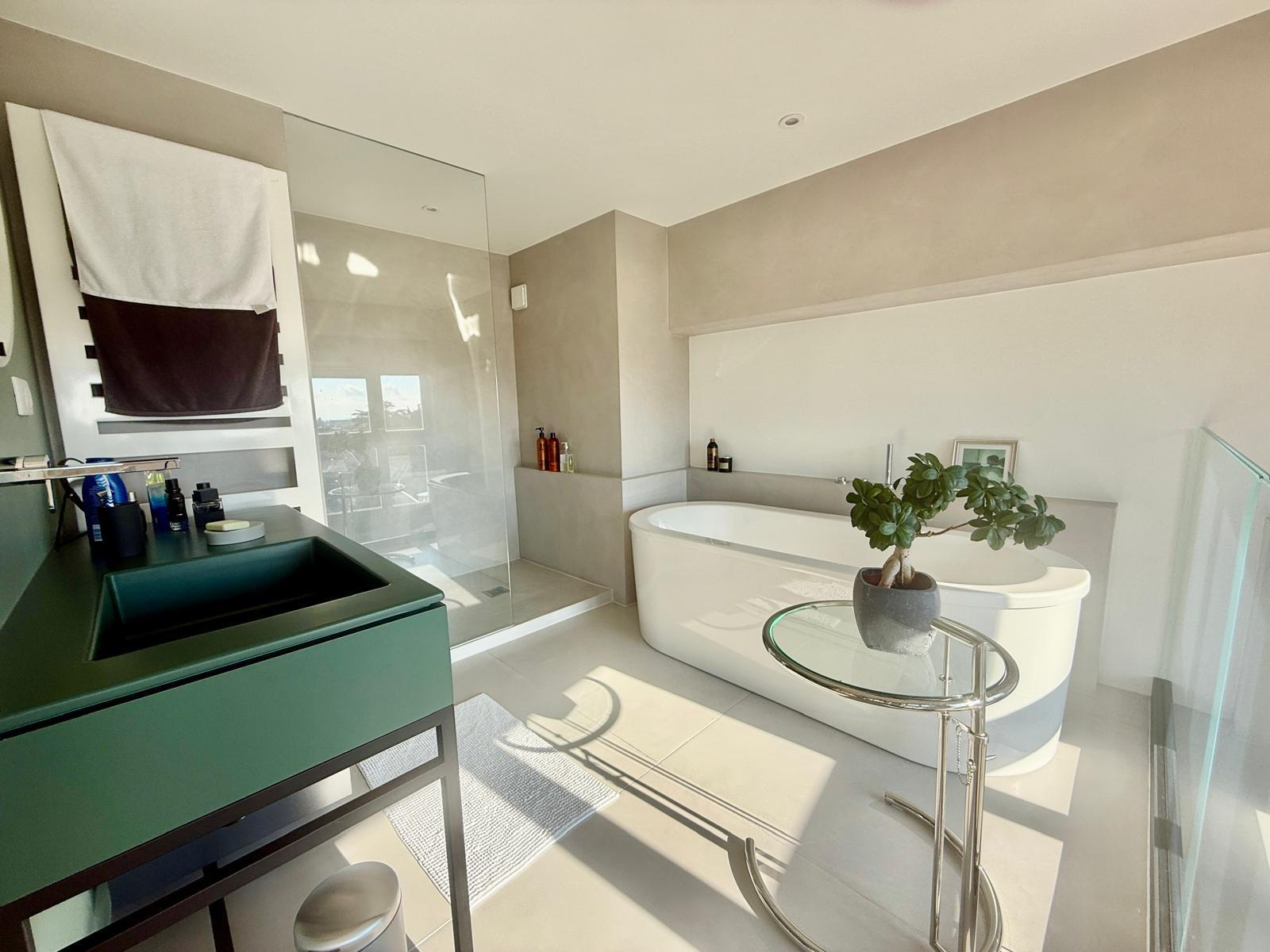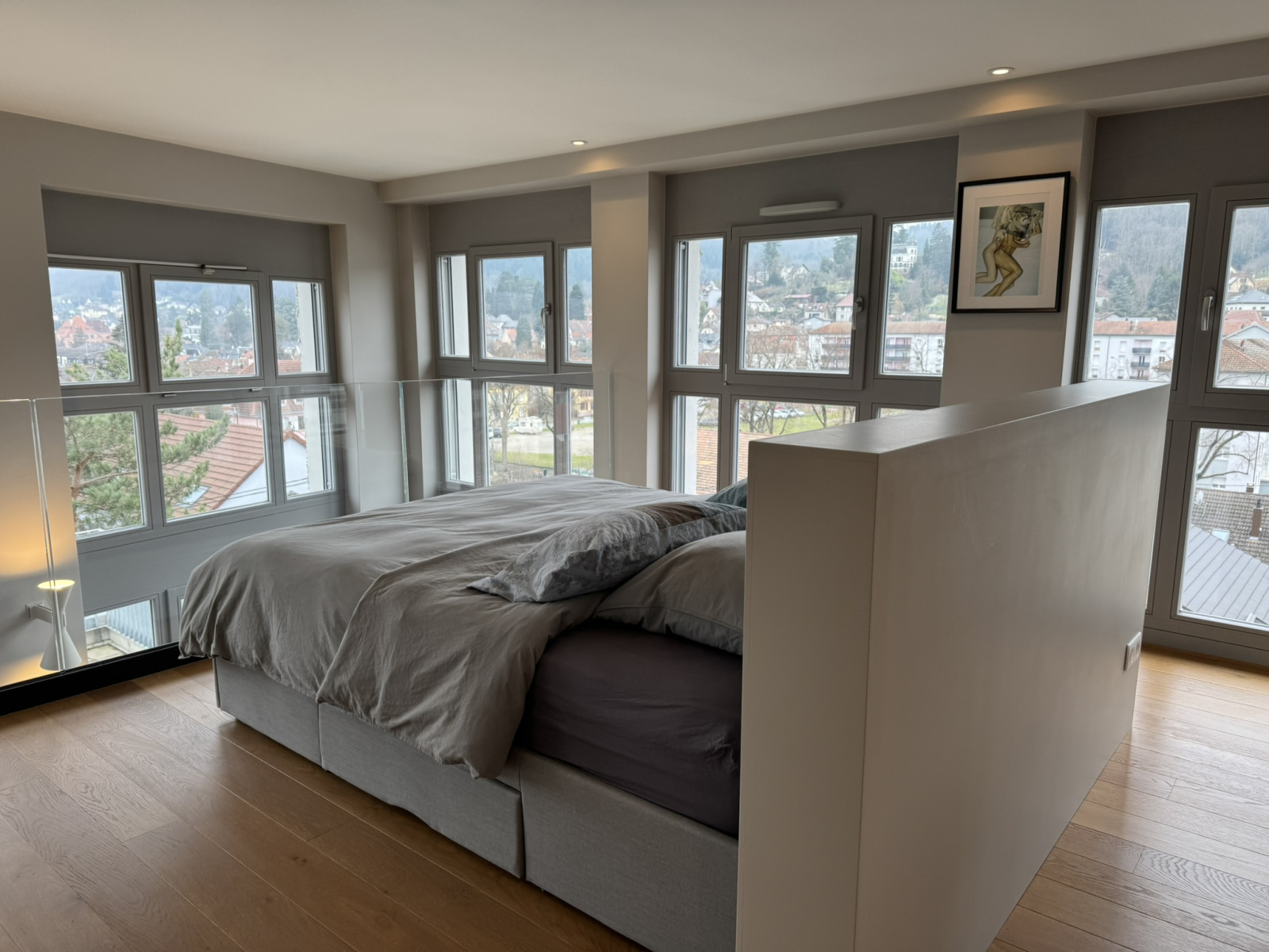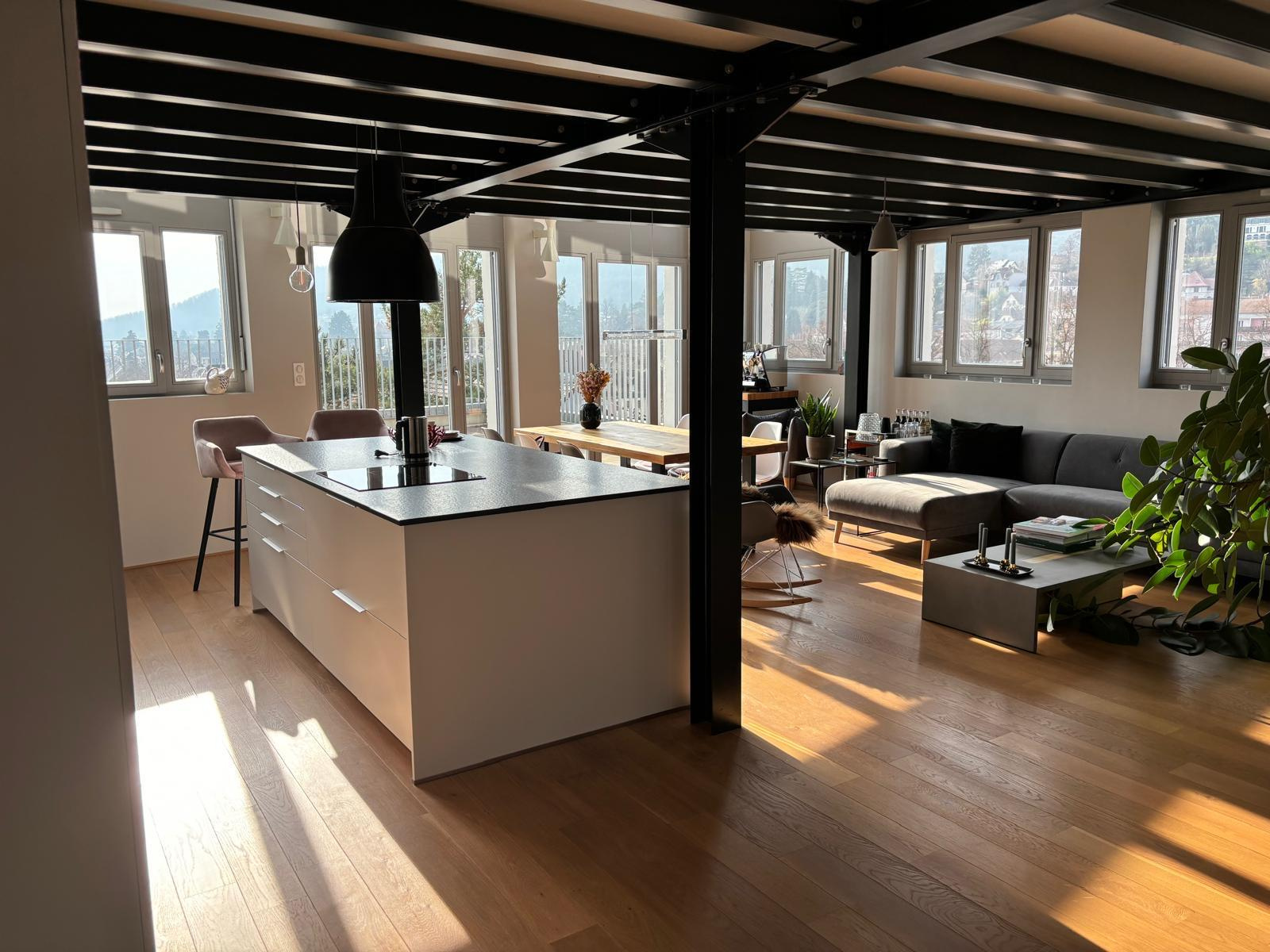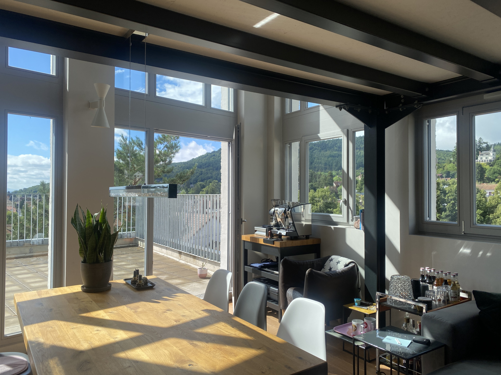 Entrée aménagée avec sobriété - dressing sur mesure, miroir - menant à un espace de vie ouvert riche en luminosité. Cuisine contemporaine toute équipée, salon, salle à manger offant un panorama sur la montagne, les vignes, la ville. Terrasse de 40 m² avec une orientation est-sud-ouest. L'idéal. Volume dégagé et éclairé par des fenêtres et bais vitrées. Haut de plafond.